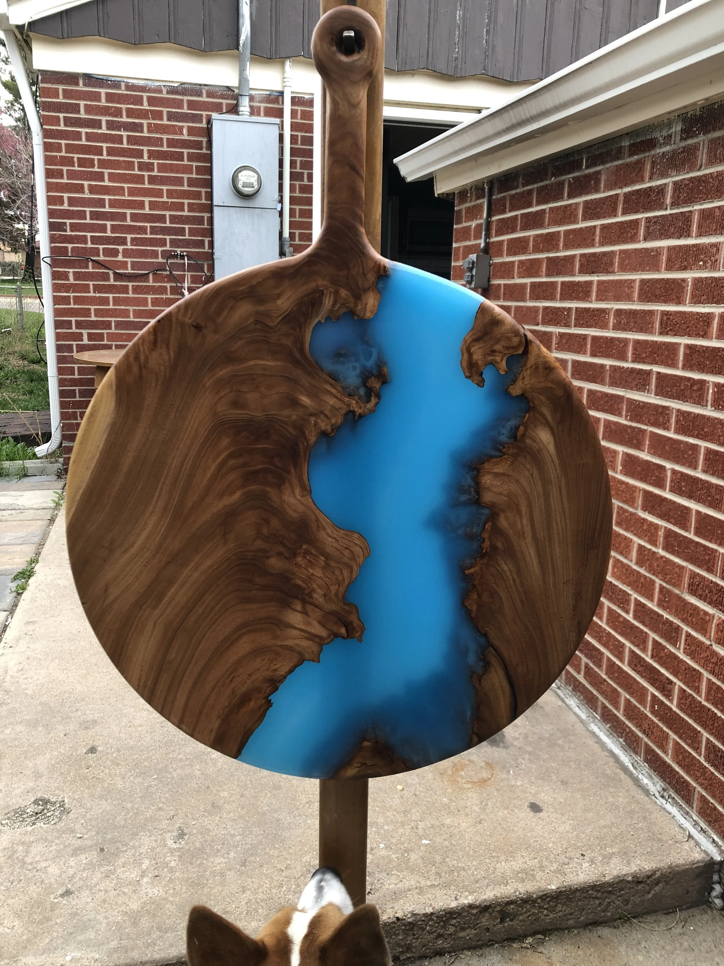 The process ends with a beautiful piece, full of color that turns all those pesky wood “imperfections” into ordered chaos. There are numerous steps I’ve skipped that went into making the Snake River Board, including designing and cutting stencils, routering, and nearly endless sanding.