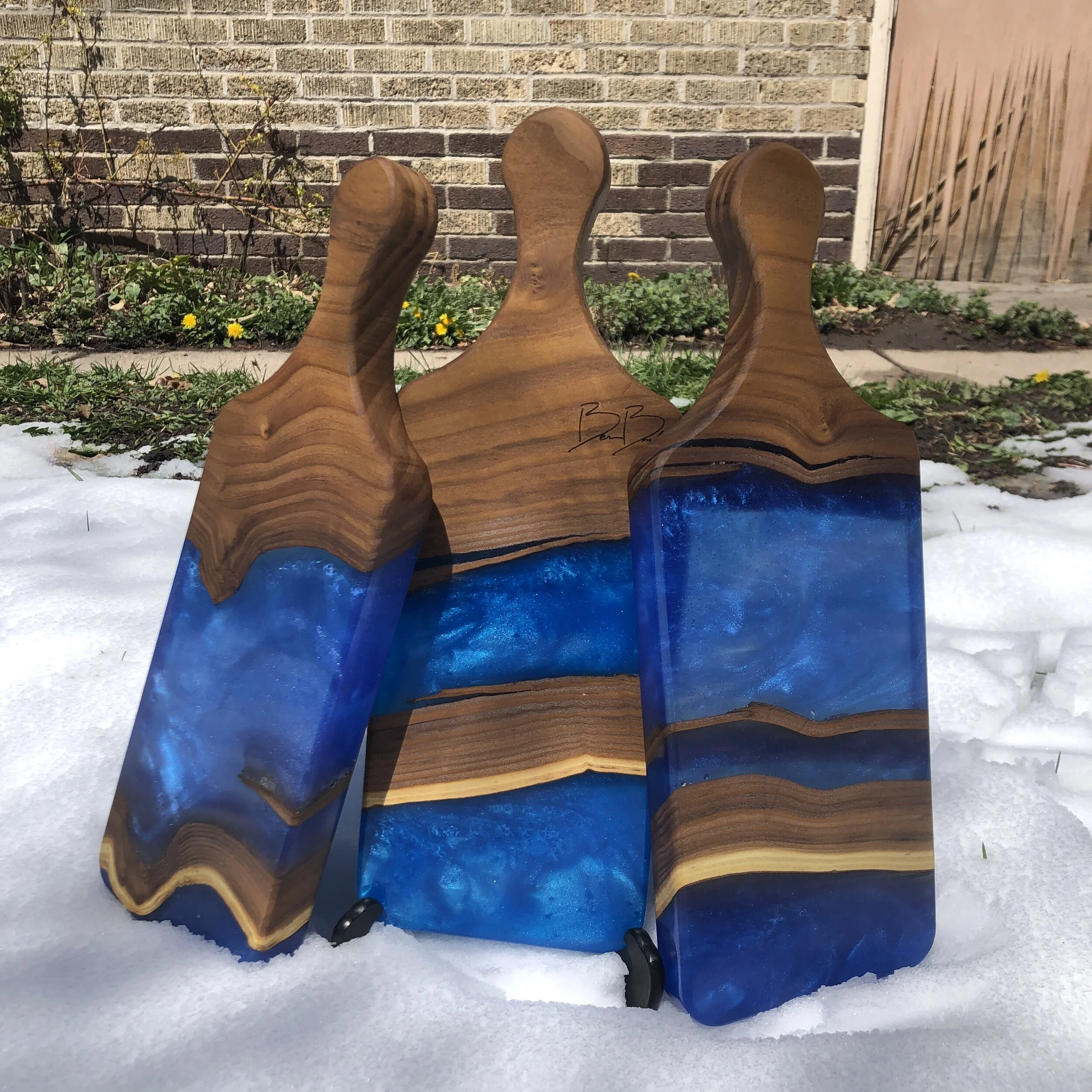 The Russian Olive Series began when I bought a great piece of Olive wood in the hopes of making a personal desk. But when it came time to choose an epoxy coloring, I couldn’t just pick one, so I cut it into a series of smaller pieces for cheeseboards. I love these boards mostly for that thin, almost-maple color at the edge of most of them. It enhances the wood’s deep color while highlighting its live edge.