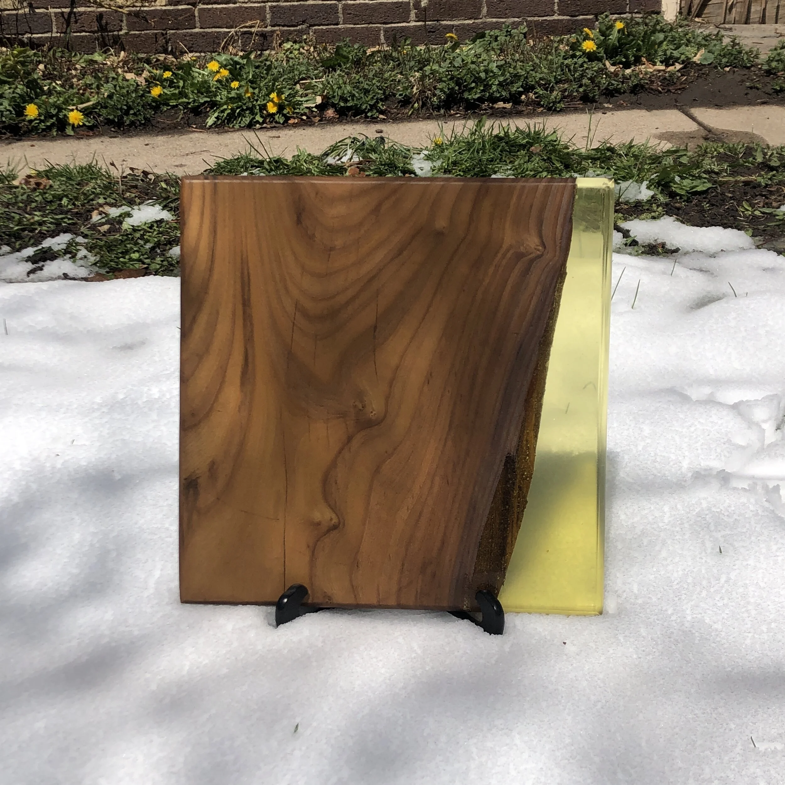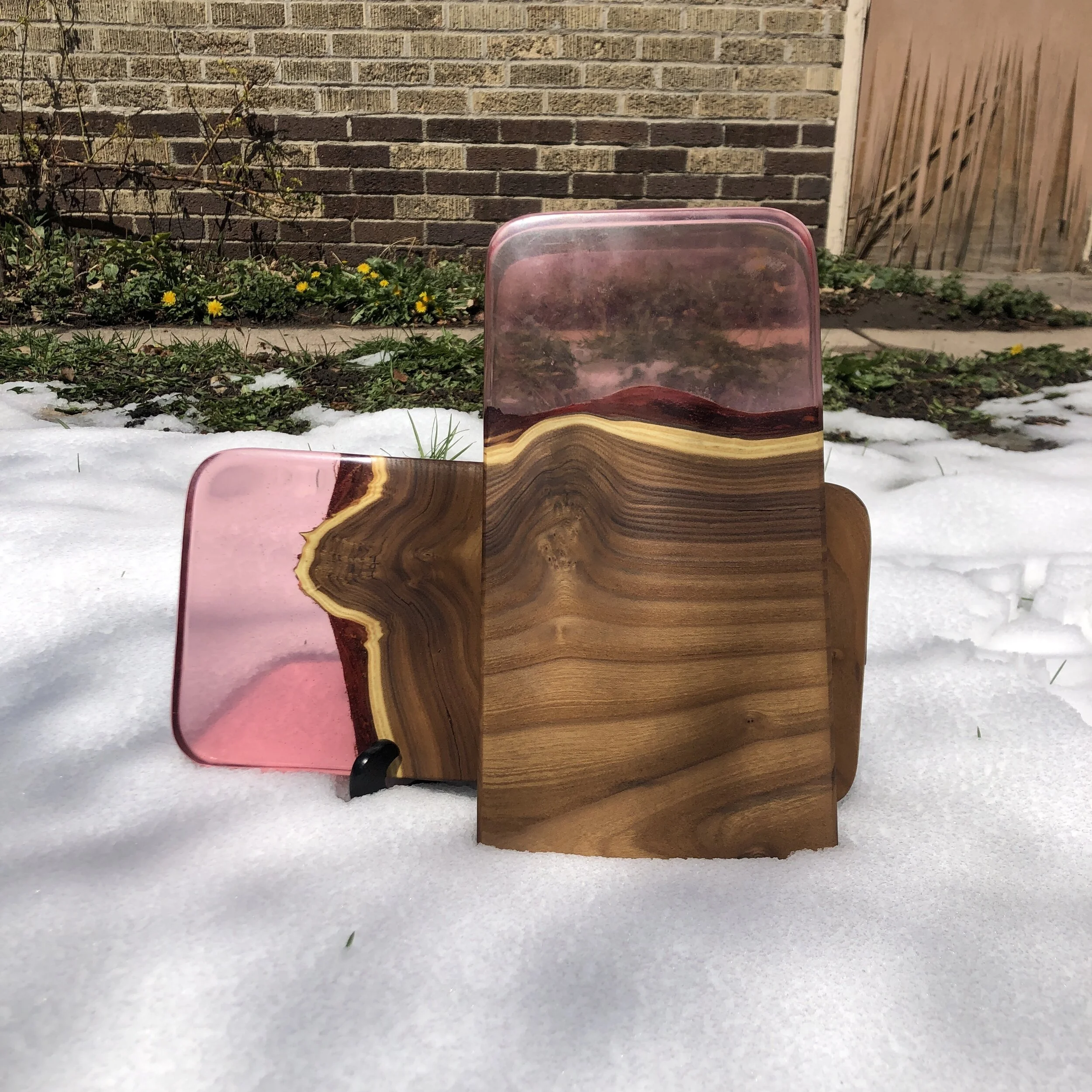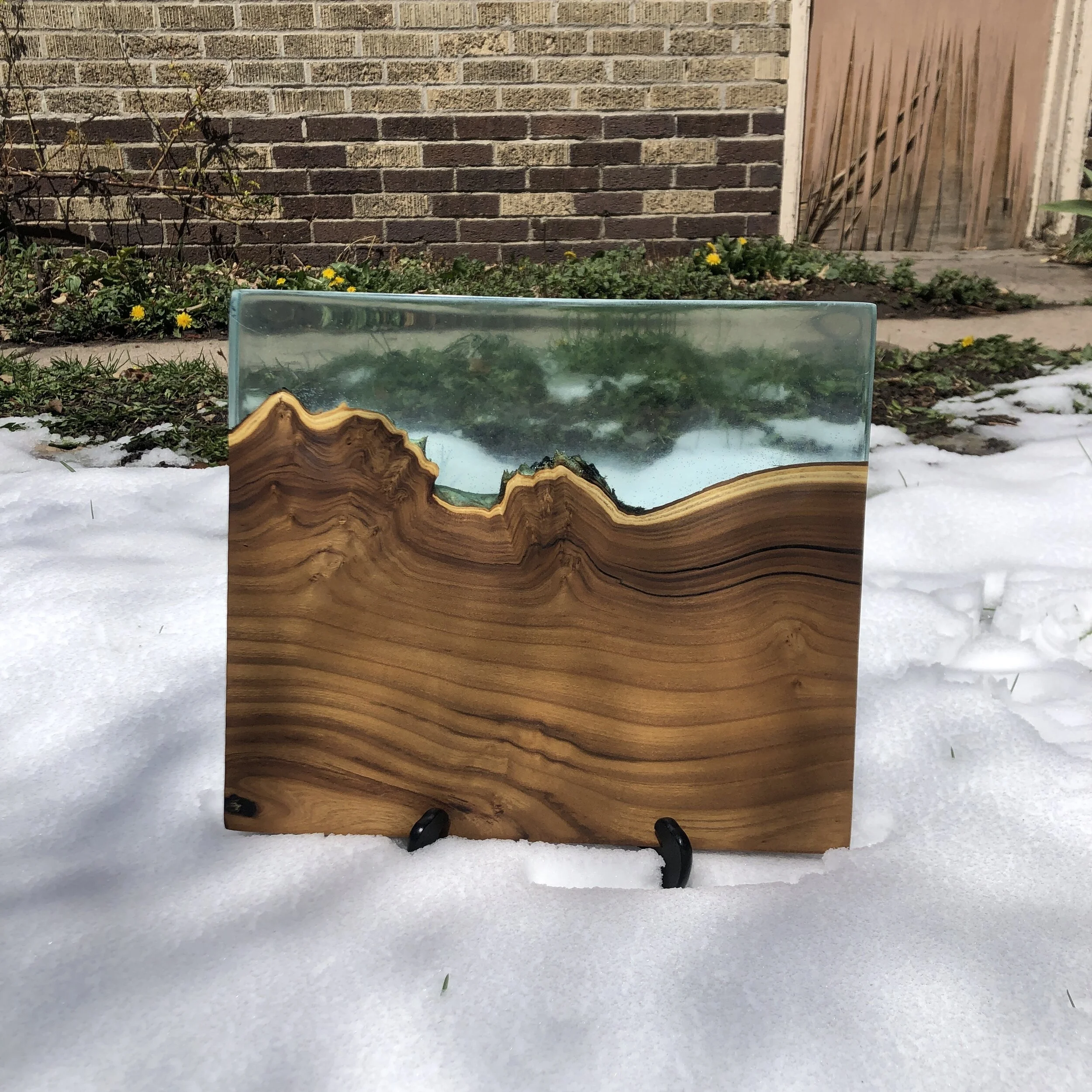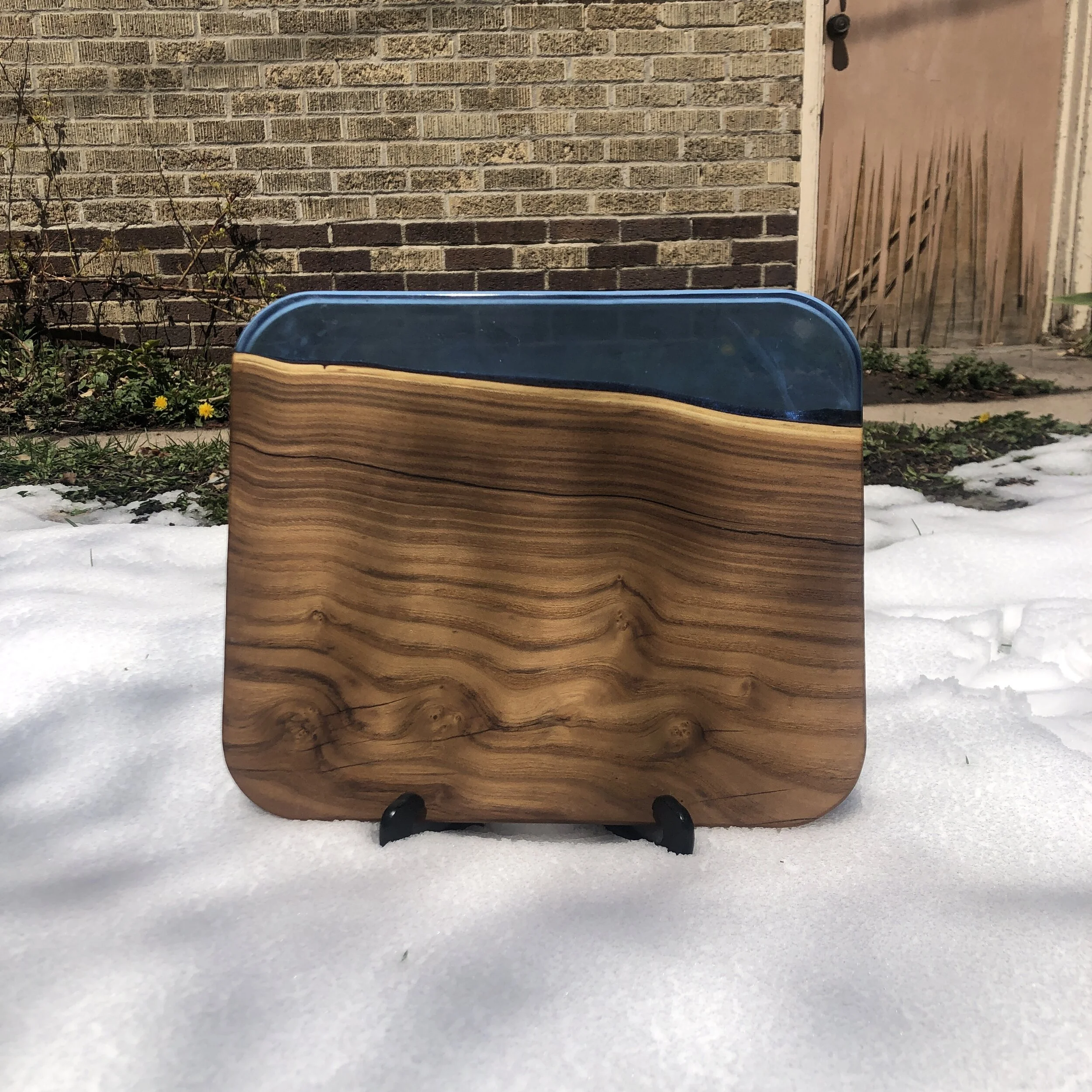 I chose a transparent dark blue on this piece because I thought the live edge looked like a beach shore.